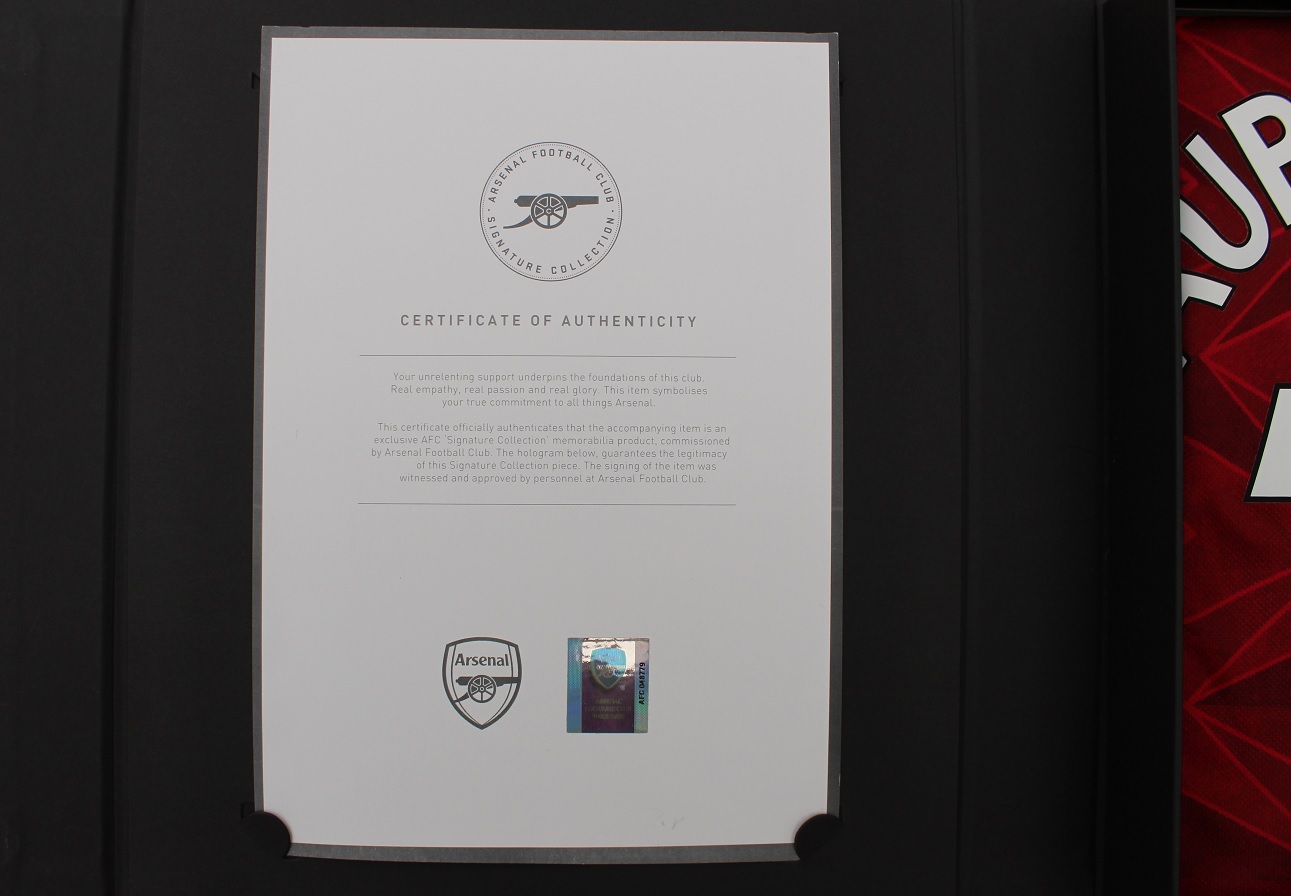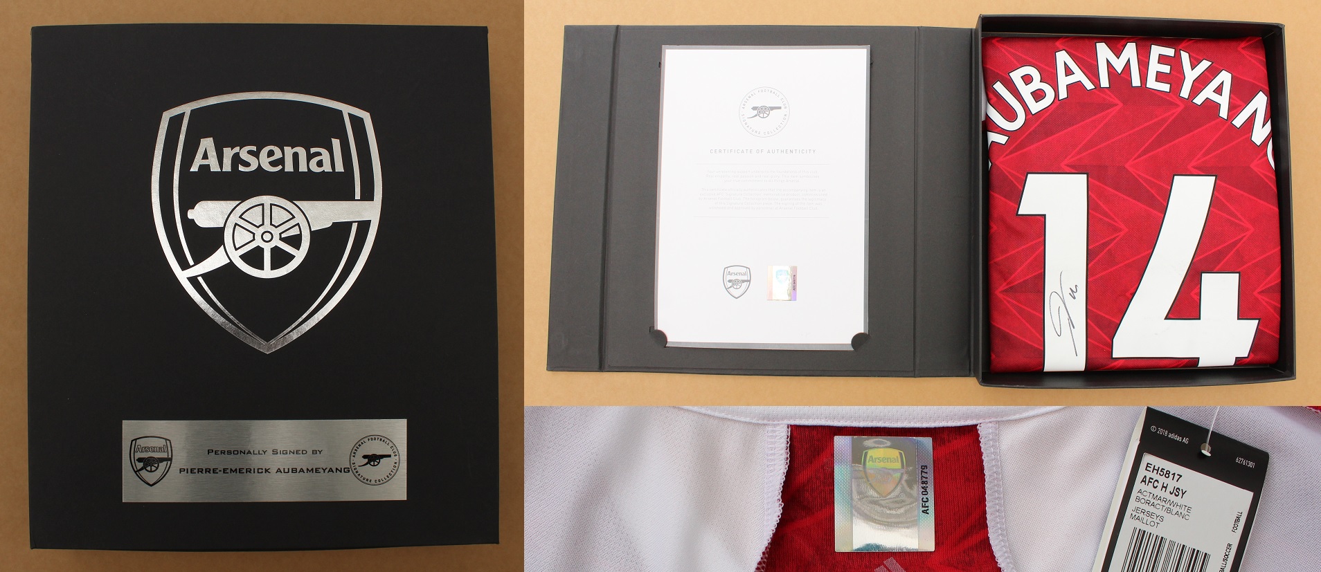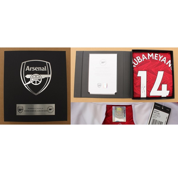 Brand new and tagged official Adidas home shirt, size Adult Medium, hand signed on his famous Number 14 during the 2020-21 season by Arsenal Captain Pierre-Emerick Aubameyang. The shirt has come direct from Arsenal FC and comes beautifully presented in a luxury gift box with official certificate of authenticity. The shirt and COA have matching holograms with matching authenticity codes. Excellent condition. Sold out in the Arsenal gift shop during the 20-21 season RRP £500.